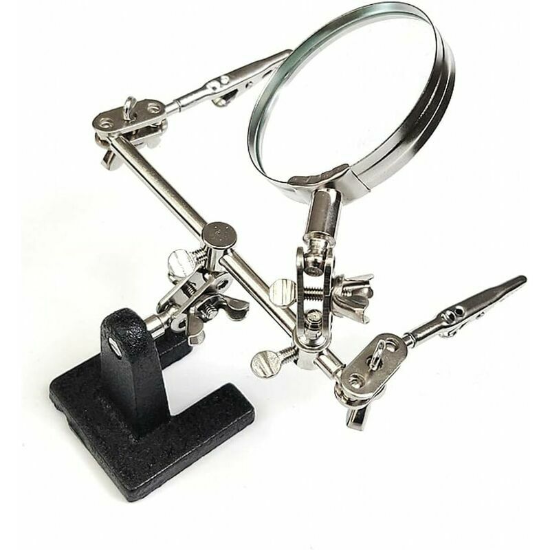 Possono anche essere ruotati e fissati a diverse angolazioni, sono montati su un braccio rotante. Non si tratta solo di guardare attraverso una lente d'ingrandimento, ma anche di vedere gli oggetti in modo sicuro da due clip a coccodrillo che lasciano entrambe le mani libere per svolgere qualsiasi lavoro necessario. Questa terza mano è estremamente utile quando si lavora con piccoli dispositivi elettronici o piccoli oggetti come gioielli o componenti elettronici, ecc. Terza mano per la saldatura e la creazione di gioielli, ausilio per l'ingrandimento con clip a coccodrillo + lente d'ingrandimento 8x + base in ghisa pesante per stabilità.