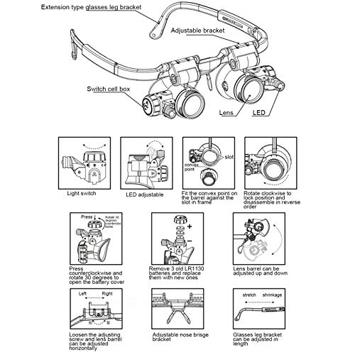 【Angolo dell'obiettivo regolabile】 La lente d'ingrandimento può essere ruotata su e giù di 180 gradi sulla staffa, l'intera lente d'ingrandimento non deve essere rimossa quando non è in uso, comodo per il riutilizzo. Luce a LED a 2 marce, luce soffusa e alta luce per far fronte a condizioni diverse