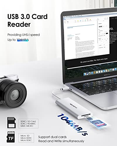 【USB C a SD / Micro SD】Le doppie schede SD/Micro SD leggono e scrivono contemporaneamente alla massima velocità di SD 3.0 (UHS-I, 104MB/s). Supporta SD/SDHC/SDXC, Micro SD/Micro SDHC/Micro SDXC, MMC/RS-MMC e altre schede di memoria. Questa è una scelta eccellente per la fotografia di famiglia, i lavoratori dei media.