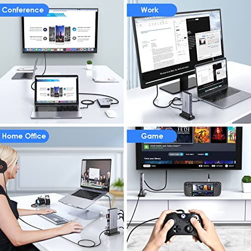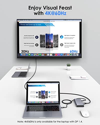 【Docking Station USB C 11-in-1】Questa docking station verticale usb c è più potente di un hub USB C con 5 USB 3.0, HDMI 4K@60hz, Gigabit Ethernet, lettore di schede SD/Micro SD, 100W di alimentazione (senza caricatore), ingresso e uscita audio da 3.5mm. Fino a 100W passano attraverso la porta di ricarica in grado di fornire 85 W per i computer portatili. Plug and play, nessun driver o software da installare.