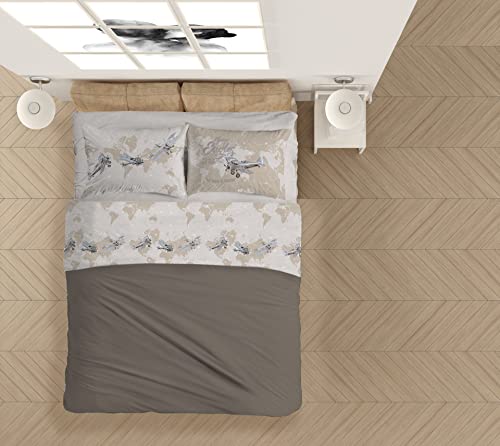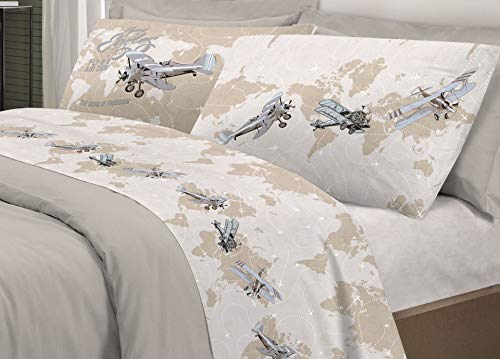 Set Lenzuola Letto Aerei per Il Mondo | Completo in Cotone Made in Italy Fantasia Aereoplani| Lenzuolo sopra + sotto con Angoli + Federa/e con Stampa in Entrambi i Lati | - 1 Piazza e Mezza - Tortora