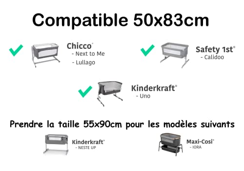 Set 2 lenzuola per le culle Cododo: con una dimensione di 50 x 83/ 55 x 90 cm e 7 cm di spessore, questo set di due lenzuola Cododo in cotone con motivi e una trapunta impermeabile, si adatta ai materassi rettangolari o ovali fino a 50 x 83 / 55 x90 cm e 7 cm di spessore grazie agli angoli estensibili.