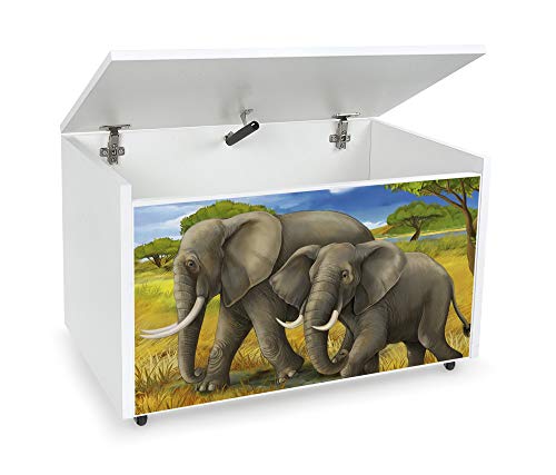 Leomark contenitore portagiochi in legno, panca su ruote 71x40x46 cm(A) 91L, scatola con coperchio, mobili per camera da letto e asili, uffici, cassapanca per bambini, stampa UV - Elefanti e leoni