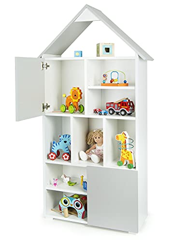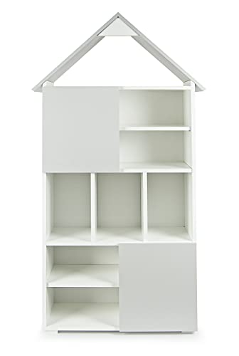 Leomark scaffale con 10 scomparti, 80 x 32 x 161cm, libreria moderna bianca e grigia a forma di casetta, libreria capiente per una stanza, cameretta e asilo