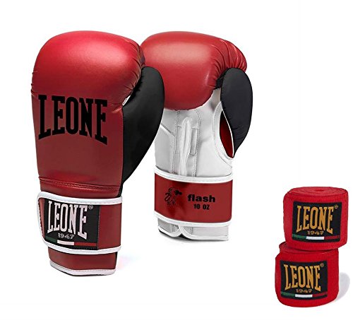 Leone 1947: Kit Guantoni 10 Oz + Fasce 3,5 metri per Boxe, Kick Boxing e Muay Thai (Flash GN083 Rosso)