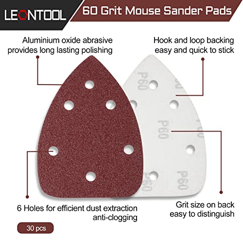 LEONTOOL 30 pezzi di carta vetrata per mouse, grana 60, 6 fori, per levigatrice per mouse, con gancio e anello, per levigatrice e dettagli, levigatrice, carta vetrata