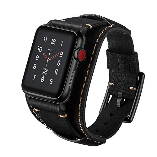 Leotop Compatibile con Apple Watch 45mm 44mm 42mm Cinturino, Cinturini in Vera Pelle Bracciale Fibbia in Acciaio Inossidabile Uomo Donna Compatibile iWatch Series 7/6/5/4/3/2/1 SE(45/44/42mm,Nero)