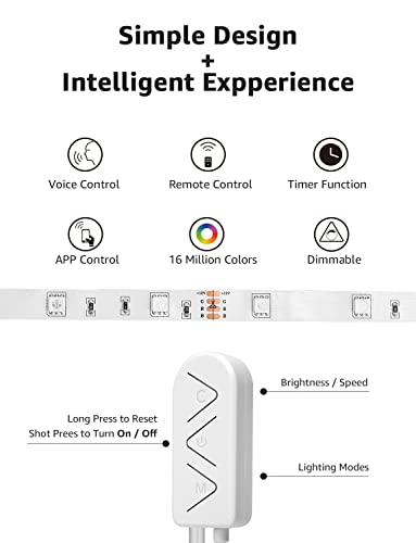 4 tipi di controllo: pronto all'uso, regolabile tramite il telecomando e il controller in dotazione. Nastro LED smart compatibile con Amazon Alexa e Google Assistant per accendere/spegnere, regolare la luminosità e cambiare colore con un semplice controllo vocale. Quando siete fuori casa, potete anche regolare le luci della vostra abitazione da remoto tramite l'app.