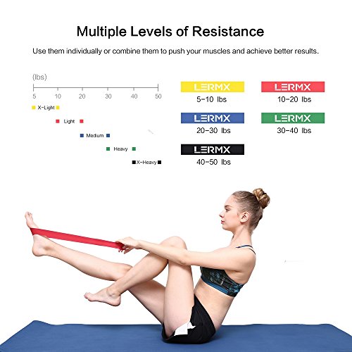 LERMX Elastiche Fitness Banda Elastica - Fasce Resistenza Bande di Resistenza Set di 5 Bande Esercizi per Fisioterapia per migliorare la mobilit¨¤ e la forza, Yoga, Pilates o per la riabilitazione delle lesioni [Carry Bag]