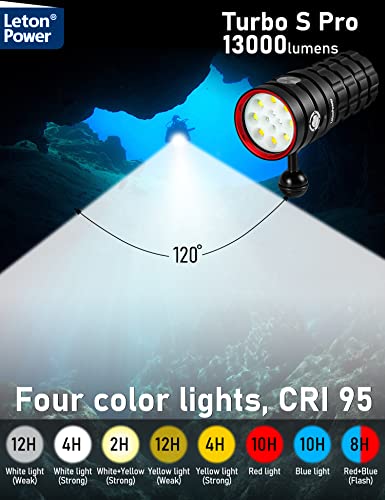 Sorgenti luminose multiple: Turbo S pro è uno strumento potente per l'illuminazione di immersioni, video subacquei e attività all'aperto. Il fascio di luce 6500K da 13000 lumen, la luce blu e la luce rossa sono in grado di restituire il vero colore degli oggetti illuminati sott'acqua. L'angolo di irradiazione è di 120° e l'ampia area è completamente irradiata.