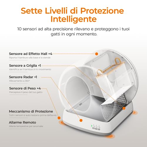 【ZERO RISCHIO PER I GATTI】 Lettiera gatto autopulente10 sensori ad alta precisione rilevano e proteggono i gatti in ogni momento. Con molteplici meccanismi di sicurezza e di eccellenti sensori intelligenti, consente ai gatti di avere una defecazione sicura. Con i sensori ad infrarossi, sensori di peso, allarmi a distanza, sistema di protezione da incidenti e rilevamento intelligente, la lettiera autopulente per gatti si interrompe automaticamente quando il gatto si avvicina o rileva un peso.