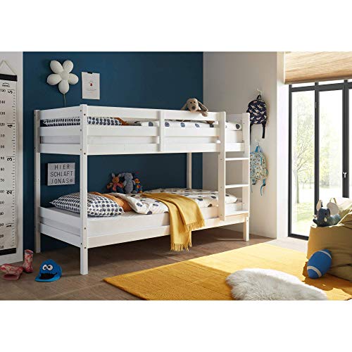 Letto a castello moderno Moritz con scala e due scale per dormire 90 x 200 cm per bambini, poco ingombrante, in pino massiccio, bianco, 97 x 140 x 207 cm, in pino bianco