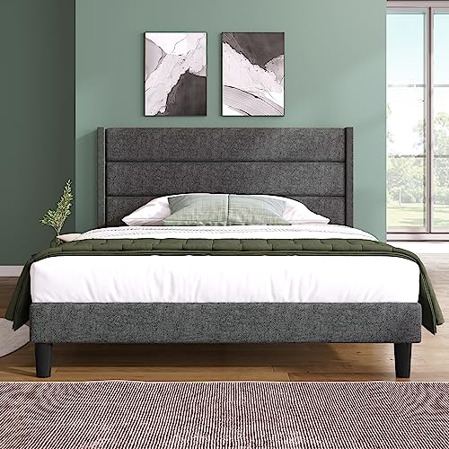 Letto imbottito matrimoniale, 140 x 200 cm, con rete a doghe e testiera, rivestimento in tessuto di lino, colore: grigio scuro, design moderno senza tempo, letto per ragazzi