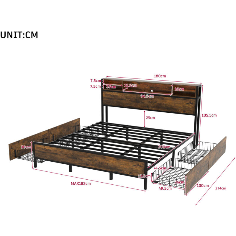 Letto basso 180x200 cm con rete a doghe e testiera, letto LED con presa di ricarica USB, letto junior con 4 cassetti per adulti e ragazzi, funzione contenitore, metallo, marrone Letto basso 140 *200 cm con letto regolabile base doghe e testiera, letto LED con presa di ricarica USB, letto junior con 4 Sc L'intero letto è composto da: di un solido telaio in acciaio con pannelli MDF marroni per un look industriale sobrio. Il letto è dotato anche di un letto. di barre luminose colorate in grado di donare toni caldi alla tua stanza. la stanza. Il letto è dotato di una stazione di ricarica USB e diversi vani portaoggetti, il che è molto comodo e pratico. Inoltre, il letto è dotato di 4 cassetti che offrono spazio per riporre cuscini, coperte, ecc. e permetterti di organizzare al meglio la tua stanza. Vieni a portarlo a casa! Descrizione + dimensioni Materiale letto: metallo+MDF Dimensioni: 180 x 200 cm Colore: marrone Numero di colli: 2 Assemblaggio richiesto: sì Origine: Cina