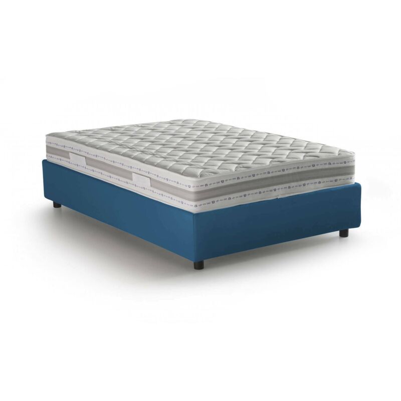 LETTO PIAZZA E MEZZA REBECCA - Letto contenitore con rivestimento in tessuto, 100% Made in Italy, Apertura frontale, con materasso Cm 120x200 incluso, Blu. STRUTTURA - La struttura del letto è in fibra di legno rialzata da terra con piedini in ABS: il giroletto è rivestito in morbido tessuto di poliestere sfoderabile e lavabile in lavatrice a 30° - La rete a doghe in legno multistrato è inclusa nella struttura - Meccanismo di apertura in ferro - L'aggiunta del pratico box contenitore salvaspazio permette al letto di trasformarsi in uno spazioso cassone per lenzuola, cuscini e piumoni. MATERASSO INCLUSO - Materasso ortopedico sfoderabile, anatomico, climatizzato a doppia portanza da 120x200 altezza 21 cm - Struttura in massello di poliuretano espanso h 17 cm, densità 30EP ricoperta da una schiuma viscoelastica in Memory Foam h 2 cm, densità 55EP losangata nella parte superiore - Rivestimento in tessuto stretch da gr 130, sfoderabile e lavabile in lavatrice a 60° - Imbottitura 100% in