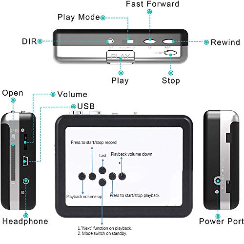 【Inversione automatica】 Registrazione automatica di brani musicali su 2 lati su un'unità USB dalla cassetta, che è alimentata dalla porta USB o da 2 batterie AA. Si prega di notare che cassette/nastri, chiavette USB e 2 batterie AA non sono incluse. Velocità audio: 44,1 e 48 kHz, 16 bit per la creazione di MP3 su YouTube