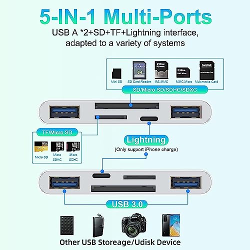 【Lettore di schede SD 5 in 1】 Questo lettore di schede SD per iPhone/Android/USB A. Ricarica per iPhone/Pad: questo lettore di schede SD USB aggiunge al suo design una porta di ricarica. La ricarica e la lettura possono essere effettuate allo stesso tempo, in modo da non doversi più preoccupare che il telefono si scarichi durante il processo di trasferimento.