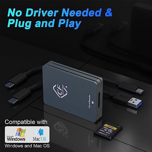 non richiede alimentazione esterna, è alimentata dal bus USB, facile e comoda da trasportare e da usare per fotografi e videografi. Compatibile con Windows XP/Vista/7/8/8.1/10, Mac OS ecc. Nota: questo lettore di schede è applicabile solo alle schede CFexpress di tipo A. Le dimensioni della scheda CFexpress Type A sono 20 x 28 x 2,8 mm.