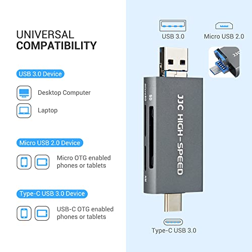 JJC Lettore di Schede SD in Metallo, 3in1 USB 3.0 Micro USB 2.0 Type-C 3.0 con 3 Slot per Schede Lettore di Schede Facile per Schede di Memoria SD SDHC SDXC Micro SD Micro SDHC Micro SDXC NM (Grigio)