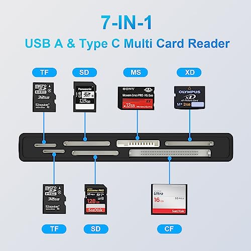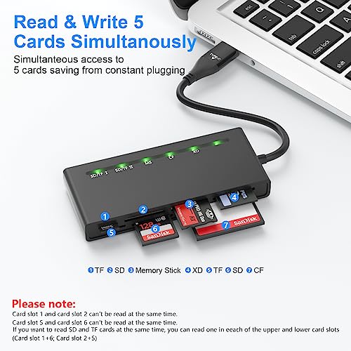 Lettore di schede USB 7 in 1: Questo lettore di schede multiple è dotato di uno slot 1*CF, 2*SD, 2*TF (Micro SD), 1*MS, 1*XD. Inoltre, questo adattatore per schede di memoria può leggere e scrivere 5 diverse schede contemporaneamente, migliorando notevolmente l'efficienza del lavoro.