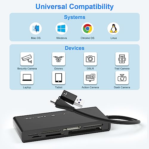 Ampia compatibilità delle schede: Questo lettore di schede USB3.0 supporta schede CF, SD, SDXC, SDHC, micro SD, micro SDXC, micro SDHC, TF, M2, MS, XD (serie completa di schede XD-Picture Card, tra cui Olympus e Fujifilm XD Picture Card da 1 GB e 2 GB), ecc.