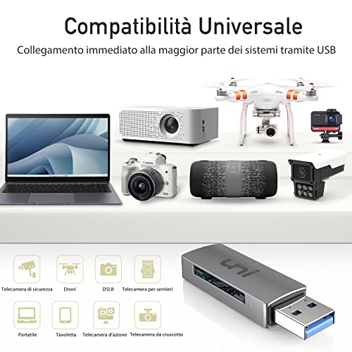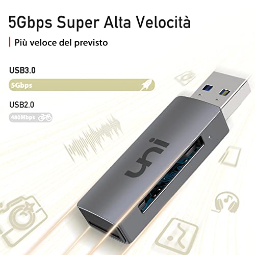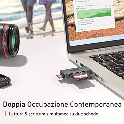 [Trasferimento Dati Superveloce] USB 3.0 offre una velocità di trasferimento dati veloce e affidabile di 5Gbps tra il computer e le schede di memoria, 10 volte più veloce di USB 2.0. uni SD Card Reader può trasferire un film UHD o un file di grandi dimensioni in pochi secondi. È retro compatibile con le porte USB 2.0 e 1.1.