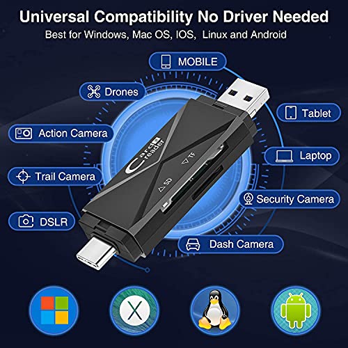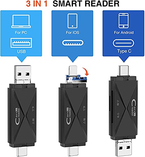 【Lettore di schede USB + Tipo C + SD + TF + OTG】- Questo adattatore USB per scheda Micro SD è progettato per la trasmissione di dati (come file, musica, immagini e video) tra la scheda SD/Micro SD e gli smartphone, tablet e fotocamere Android. e computer che supportano la funzione OTG. (AVI: il lettore di schede non è compatibile con iPhone o iPad)