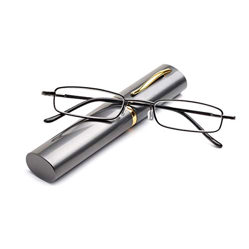 Lettura flessibile di occhiali in metallo Ausilio visivo Fodero in piuma Supporto per la lettura Lettore unisex con custodia per occhiali come portapenne(grigio,+1.5)
