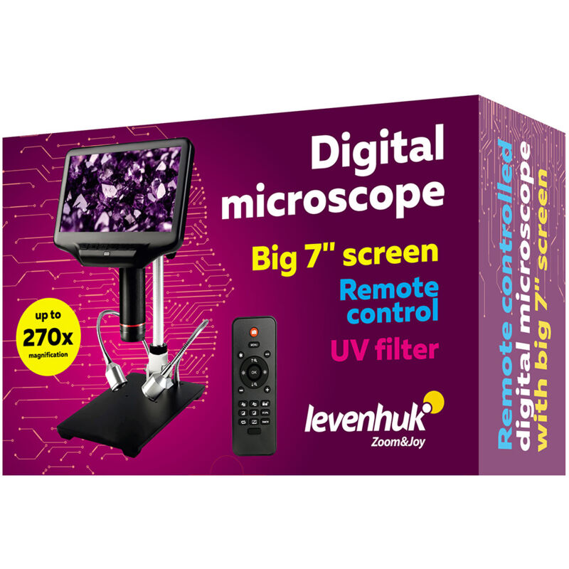Il microscopio DTX RC4 Levenhuk con telecomando consente di studiare campioni sotto ingrandimento, nonché di scattare foto e registrare video a scopo di ricerca. E la qualità è davvero impressionante: il sensore integrato permette di scattare foto e registrare video con risoluzione Ultra HD. Grazie a queste caratteristiche ottiche e digitali è possibile catturare ogni dettaglio dei soggetti e studiarli nel modo più dettagliato possibile. Il microscopio è un ottimo aiuto per la riparazione di apparecchiature e componenti elettronici, la valutazione di gioielli e lo studio di campioni geologici. Ampio display LCD rotante Lo schermo integrato ha una diagonale di 7 pollici. L'immagine trasmessa dall'obiettivo viene visualizzata a colori, è contrastata e di facile lettura. Lo schermo può essere leggermente inclinato per rendere il lavoro più confortevole. L'ingrandimento totale può essere regolato da 5 a 270 volte e l'ingrandimento ottico varia da 5 a 40 volte. L'immagine può essere