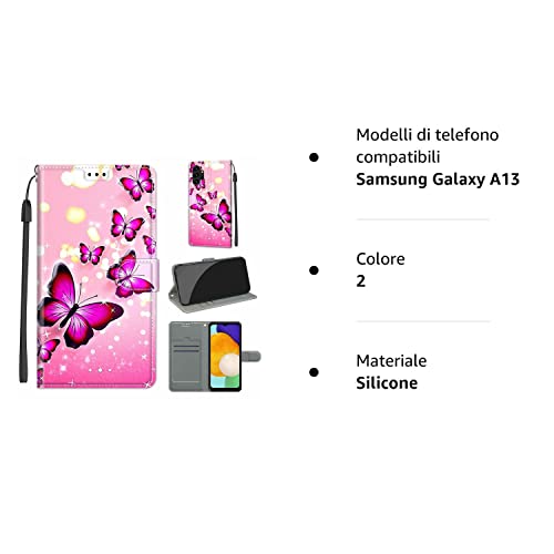 LeviDo Cover Compatibile per Samsung Galaxy A13 4G Silicone Libro Motivo PU Pelle Magnetica Flip Portafoglio con Corda Disegni Antiurto Bumper Custodia Resistente Protettiva Case, Farfalla