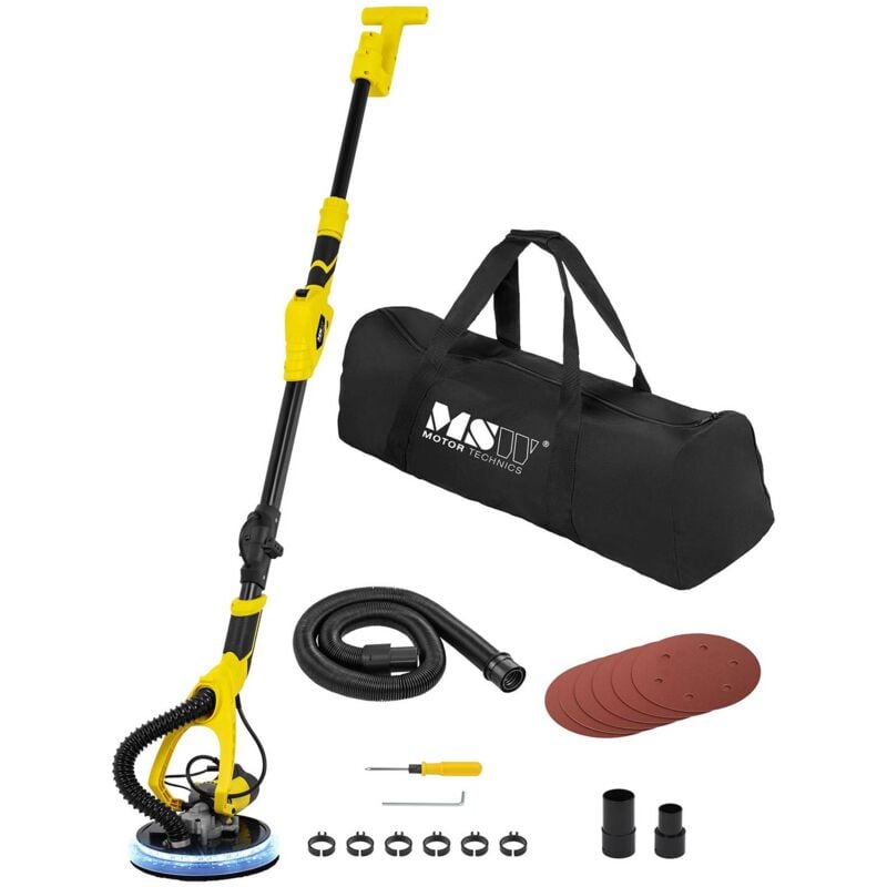 Levigatrice per muri MSW-DWS-750 di MSW _x000D_ La levigatrice portatile per cartongesso convince per il suo peso ridotto e il suo potente motore elettrico da 750 W. La sua velocità può essere regolata in modo semplice tra 1.000 e 2.100 giri/min tramite la manopola. La giraffa per cartongesso dispone di un'asta telescopica che raggiunge una lunghezza totale di 1,8 metri, ideale per lavori in aree particolarmente alte. Con un angolo di inclinazione di 0-135° verso il davanti e di 30° sia a destra che a sinistra, la levigatrice a giraffa copre tutti i passaggi da irregolarità grosse fino a lavori di rifinitura su pareti e soffitti verniciati ed è estremamente comoda da usare. _x000D_ Dettagli tecnici _x000D_ Tensione 230 V Potenza 750 W Velocità 1.000 - 2.100 giri/min Regolatore di velocità Sì Materiale dell'alloggiamento Plastica (PA6 e GF30) Diametro della mola abrasiva [mm] 225 mm Blocco per funzionamento continuo Sì Lunghezza del tubo di aspirazione 1,15 - 4,40 m Lunghezza asta