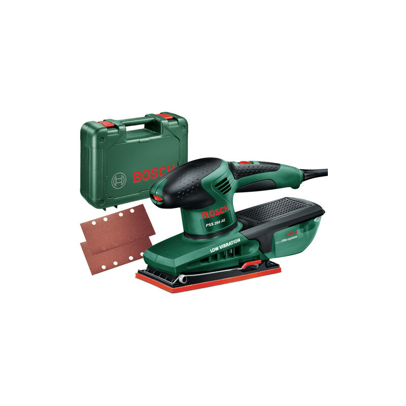 Potenza 250 watt, piastra di levigatura 92x182 mm., n° oscillazioni 24.000 giri/min., ø oscillazioni 2,0 mm., attacco microvelcro e a pinza, rivestimento softgrip, aspirazione polvere integrata con sistema microfilter. dotazione: set 25 fogli abrasivi