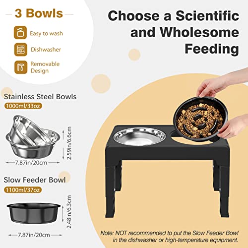 Lewondr Ciotola per Cani e Gatti Regolabile e Rialzata con 3 Ciotole in Acciaio Inossidabile, Ciotola Cane ad Alimentazione Lenta con Supporto di 4 Altezze Regolabili per Cibo e Acqua, Nero