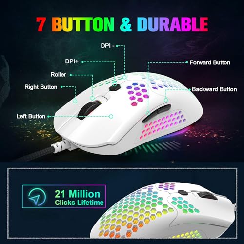 【Mouse ultraleggero e traspirante】 Il mouse è progettato con un guscio a nido d'ape leggero e un cavo ultraleggero. Forniscono ventilazione per mantenere i palmi delle mani freschi e freschi. Pulire il mouse è facile. Fino a 12000 dpi (livello 6/modificabile), soddisfa le tue esigenze di navigazione web e giochi veloci. Progettato con un guscio a nido d'ape leggero a forma di O, molto comodo da usare.