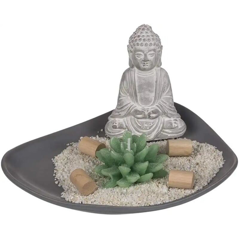 Un bel set regalo per qualsiasi casa tranquilla. Una madre, che ama la sua casa, apprezzerebbe sicuramente questo set di lumini da tè. Viene fornito con piastra in legno di colore grigio, ca. 20 x 16 cm, con Buddha di cemento, sabbia deco, candela di cactus e bastoncini decorativi in legno, in confezione regalo. Semplice, ma elegante. Set regalo multioggetto. In confezione regalo. Dimensioni piatto: 20 x 16 cm.