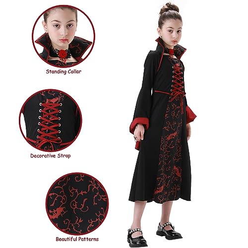 ✦ Design e Stile: Questo vestito vampiro gotico bambina presenta elementi come un collare in piedi design, mostrando un fascino unico e affascinante. Modello vintage,polsini larghi e lisci,cinghie rossa sul petto,cerniere laterali.Questi elementi di design insieme creano un aspetto nobile, misterioso ed elegante vampiro.