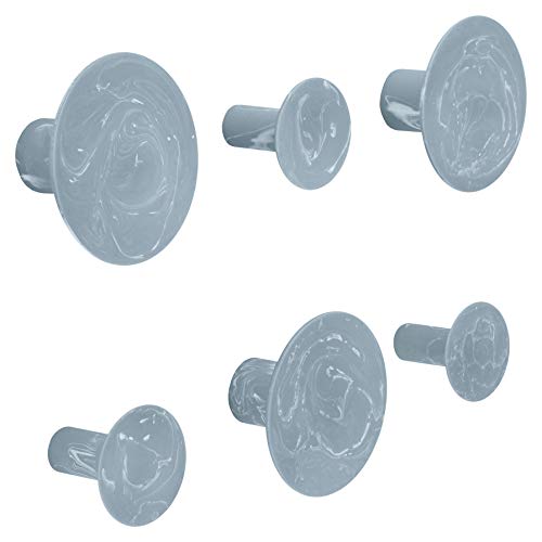 Materiale e dimensioni: pietra artificiale (poliresina) grigia marmorizzata con vite in acciaio, set da 6 pezzi composto da 3 grandi (diametro 8 cm) e 3 piccole (diametro 4,5 cm)