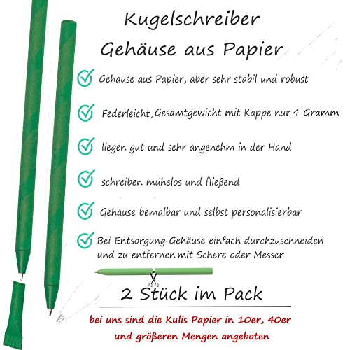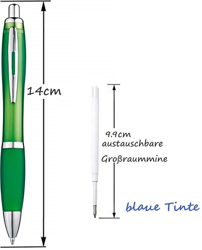 La pratica penna blu con cassa di colore verde ha una lunghezza di circa 14 cm, mina: BLAU.️ Contenuto della confezione: 50 penne a sfera ergonomiche di grande capacità, inchiostro blu, corpo in plastica di colore verde e 2 penne a sfera di carta speciale, corpo in carta, leggere, robuste, comode da scrivere