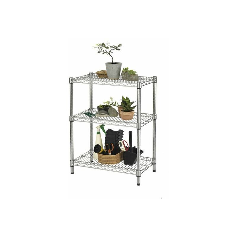 Scaffale robusto fin outdoor con 3 piani cm 36 x 60 x 75 Scaffale in filo d'acciaio con finitura speciale zincata e verniciata cromata. Adatto all'uso in esterni. COMPLETO DI GUANCETTE PER IL FISSAGGIO DEI RIPIANI ALL'ALTEZZA DESIDERATA IN CORRISPONDENZA DELLE APPOSITE SCANALATURE PRESENTI SUI TUBOLARI MONTANTI (OGNI 2,5 CM). Tubolari con tappo superiore nero in plastica, mazzetta e piedino regolabile. Portata massima ripiani: 100 kg (distribuiti). Spessore filo: mm 6/4/3/GAP 20. Altezza anello: cm 4. Diametro tubolari: cm 2,54. Non compatibile con gli altri componenti della serie Archimede system. Misura effettiva: cm 36x61xh75.