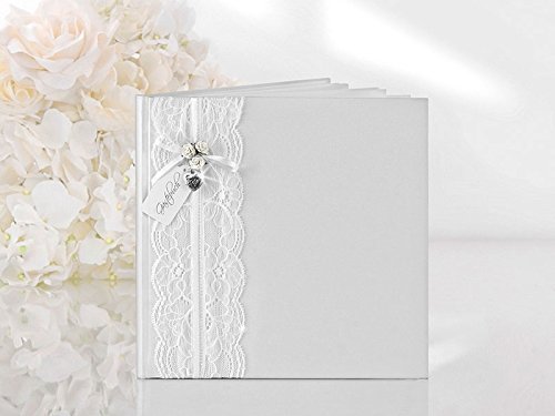 Elegante hocheits libro degli ospiti decorata con pizzo bianco, tessuto bianco Rose e metallo cuore