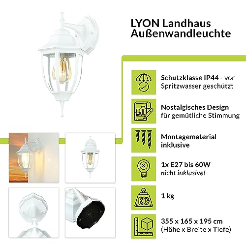 Licht-Erlebnisse Applique da esterno Lyon stile rustico bianco E27 impermeabile IP44 LED perfetto per illuminare le pareti del giardino, terrazzo, balcone e cortile