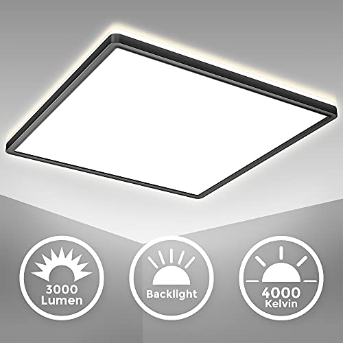 B.K.Licht Plafoniera LED ultra piatta 2,9cm, LED integrati 22W 3000Lm, luce bianca naturale 4000K, Lampada da soffitto con illuminazione indiretta, quadrata lato 42cm, contorno nero, IP20