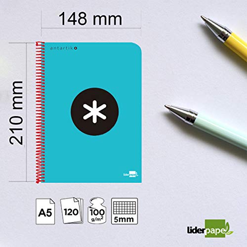 Liderpapel Quaderno a spirale A5 Micro Antartik Copertina foderata 120H 100 g Quadro 5 mm 5 bande 6 fori colore turchese