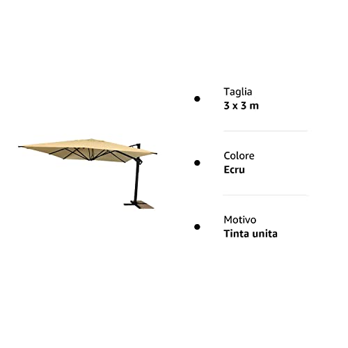 LIFE IS Ombrellone da Giardino a Palo Laterale con apertura AUTOMATICA,misura 3x3 metri.Palo in alluminio 96x64 mm.Camino Antivento.Base a Croce girevole a 360°.Cover Invernale inclusa.Colore Ecru