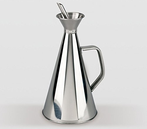 In acciaio inox, con tappo versatore anti-goccia.Tappo in gomma a chiusura perfetta. Professionale.