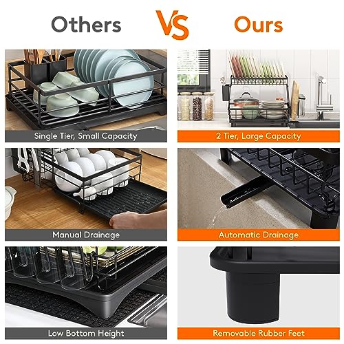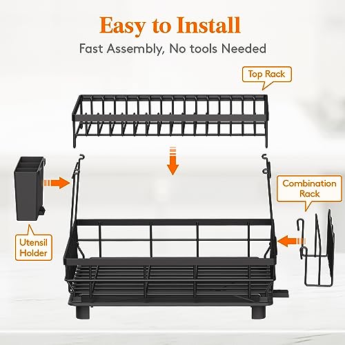 Lifewit scolapiatti da appoggio, scolapiatti da lavello a 2 ripiani con vassoio di sgocciolamento, scolapiatti staccabile con supporto per utensili e portabicchieri per piano di lavoro cucina, nero