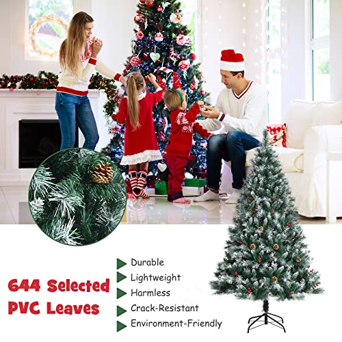 LIFEZEAL Albero di Natale artificiale, innevato, albero di Natale con rami densi in PVC, albero di Natale con pigne e bacche rosse, supporto in acciaio bianco