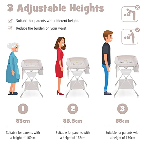 【Fasciatoio Regolabile 3 in 1】 Questo è un fasciatoio multifunzionale con design 3 in 1, che ti consente di cambiare il pannolino e i vestiti del tuo bambino, ma include anche un bagnetto e uno stendino. Il fasciatoio può essere regolato ad un'altezza di 83/85,5/88 cm in modo da non doverti piegare.