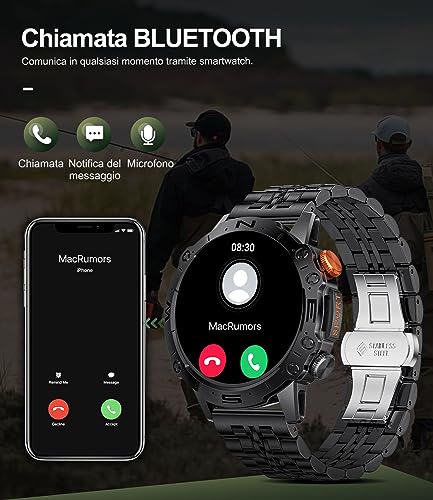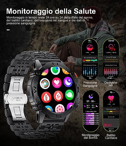 【Robustezza di Qualità Militare e Batteria da 360mAh】 Questo orologio connesso per uomini adotta un design militare e ha superato i test militari di resistenza alla polvere, all'acqua e alle esplosioni. Sia gli appassionati di fitness che gli sportivi estremi possono contare su questo smartwatch per accompagnarli nelle loro avventure. Inoltre, la batteria da 360mAh offre un'autonomia di 3 a 7 giorni, consentendovi di godere di un'esperienza durevole con tecnologia intelligente.
