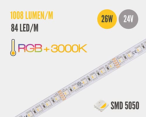 IOT Light AstraLed - Striscia Led Professionale RGBW (RGB+Bianco Caldo) 5050 24V 84 Led/m 26 W/m 1008 Lm/m. Ideale per controsoffitti e velette in cartongesso. 5 metri (RGB+Bianco Caldo 3000K)